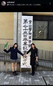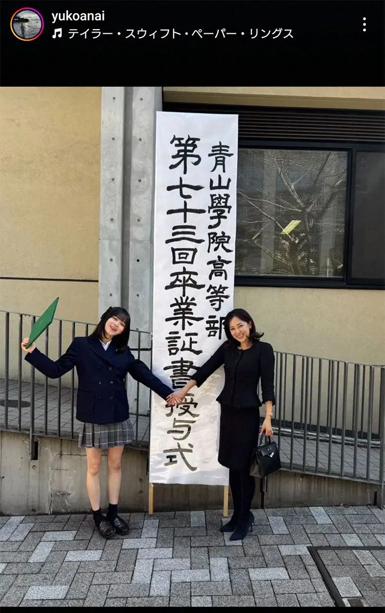 穴井は黒のスーツ姿で、青山学院高等部の卒業式の看板の前で卒業証書を持った真子と一緒にポーズを取る写真などを投稿した穴井は「卒業おめでとう」と祝福。