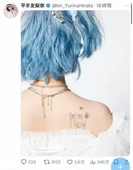 11日の投稿では、青髪をツインテールにし、カメラに背を向けた1枚の写真をアップ。背中には王冠や猫、リボンなどの“タトゥー”が入っていた。