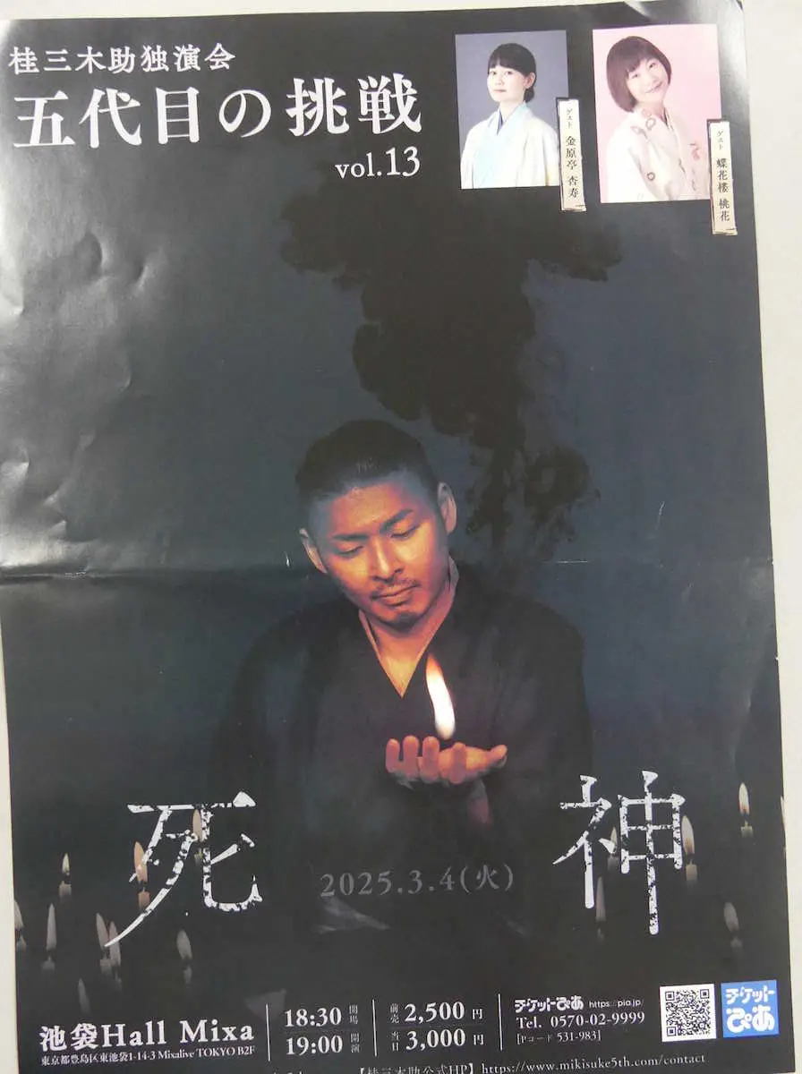 三木助は自身のXで「死神は怖さ重視なので、ゲストは明るい2人に任せました」と公表していたが、最初に登場したのは蝶花楼桃花(43)だった。1月末に楽屋で転倒して右手を骨折。ギプスで固定しながら奮闘していたが、この日やっと外すことができたと話し「扇子も右手で持てる」と、うれしそう。とはいえ、快癒を宣言するにはもう少し時間が必要な感じに見えた。