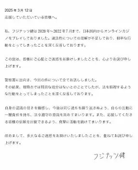 フジナッツは12日、「ご報告」として直筆署名入りの文書を投稿。「応援していただいている皆様へ 私、フジナッツ健は2020年~2022年7月まで、日本国内からオンラインカジノをプレイしておりました」と告白した。
