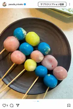 そして「おやつは次男とお団子作りました」と報告。「ちょっと。。色はびっくりしますよ 食紅を少しにしたかったのだけど、入れ過ぎて。。。なんてカラフルな」と三色団子の写真を公開し、「青が濃い!!!次男は、これでも喜んで大量に食べてくれました!」とつづった。