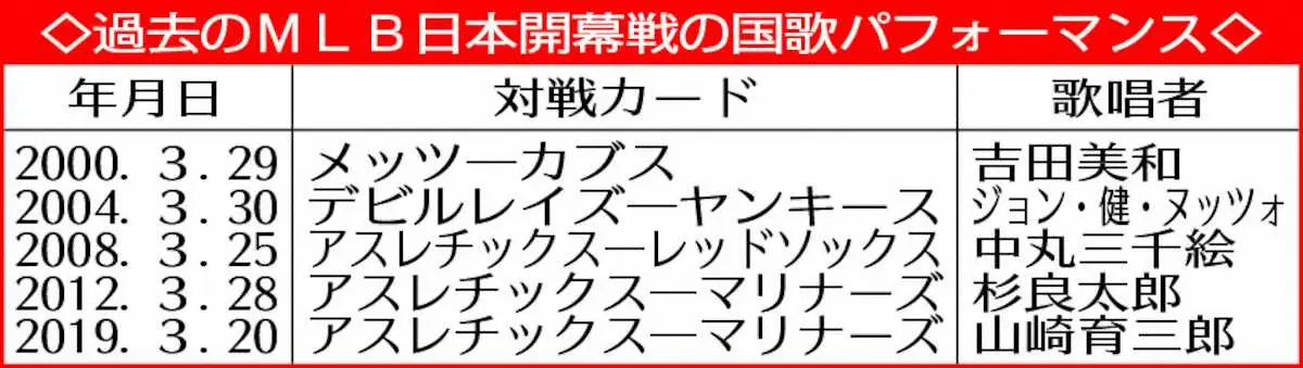 19年、アスレチックス―マリナーズ戦の試合前セレモニー国家独唱する山崎育三郎 YOSHIKI 18日MLB開幕戦で日米国歌を演奏 歴史的一戦をピアノで彩る「最… ギャラリーで見る この記事のフォト 2025年03月14日の画像一覧 もっと見る 2025年03月14日の画像をもっと見る