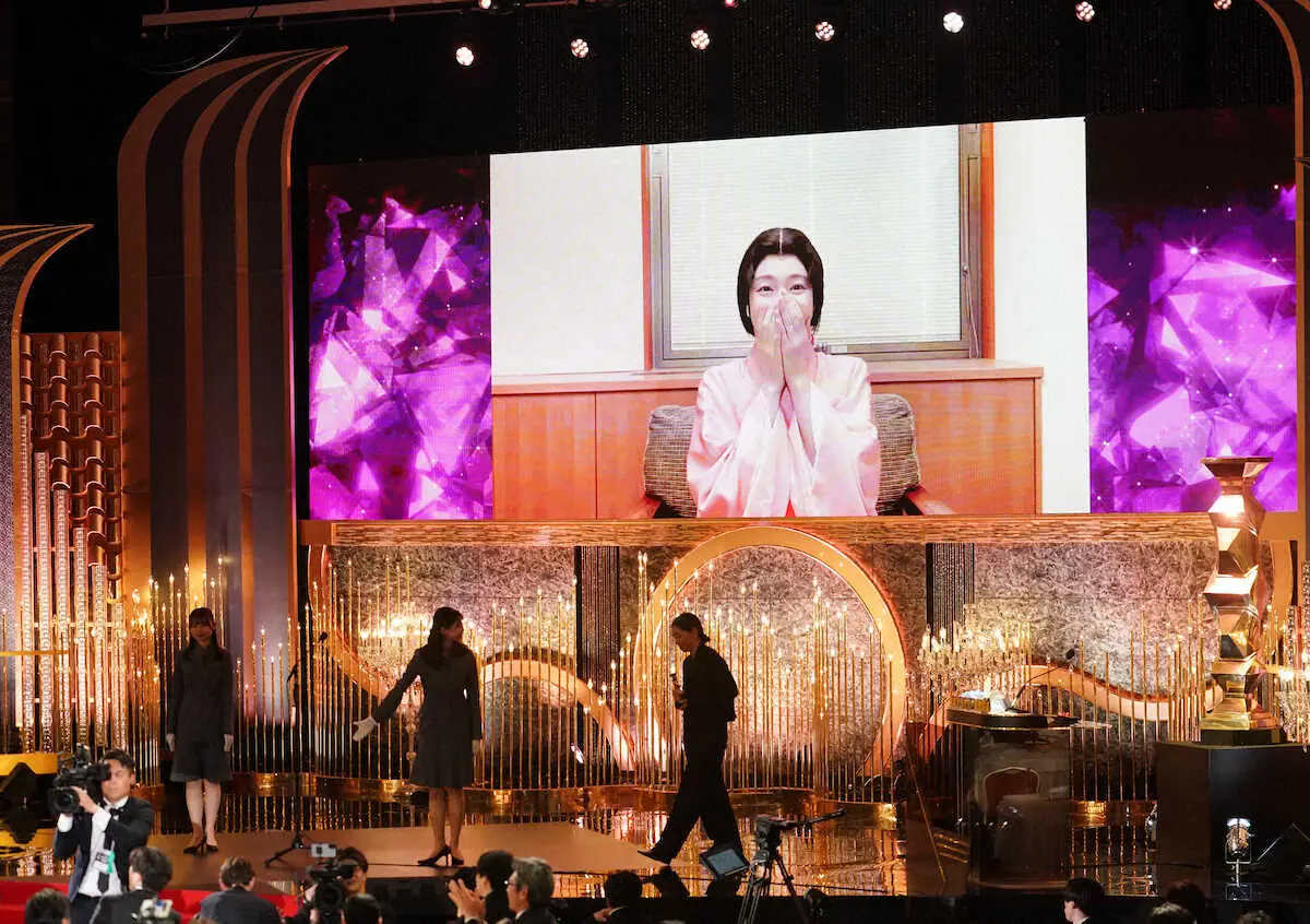 第48回日本アカデミー賞授賞式 最優秀助演女優賞に選ばれ代理でトロフィーを受け取る藤井道人監督(手前左)とリモート出演で驚いた様子の吉岡里帆 Photo by 代表撮影 【日本アカデミー賞】吉岡里帆「本当にびっくりしすぎて…」目を見開き顔覆… ギャラリーで見る この記事のフォト 2025年03月14日の画像一覧 もっと見る 2025年03月14日の画像をもっと見る
