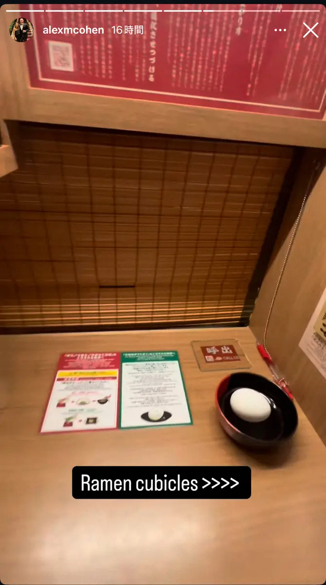 腹ごしらえにやってきたのは人気ラーメンチェーンの「一蘭」。インスタグラムのストーリーズでは個室のように仕切りのあるカウンター(「味集中カウンター」)で名物のとんこつラーメンを楽しむ様子を投稿。Xでは「豊かな生活へようこそ」とつづった。