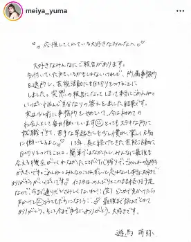 「最後にみんなと会える機会を作れなくてごめんね。たくさん感謝していますありがとう!!」と感謝を記した。また「これまでこんな私をずっと応援してくれてたみんな」「一緒に頑張ってくださった事務所の方々」「理解をしてくれて支えてくれた友達のみんな」「そしてずっとずっと後悔がなくなるまで夢を応援してくれてた家族」「本当にありがとうございました!みーんなだいすきーーー!!」と伝えるとともに直筆の文書も投稿した。