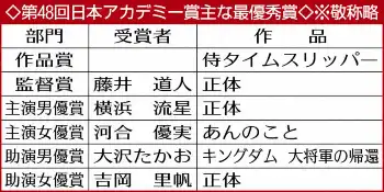 第48回日本アカデミー賞の授賞式が14日、都内のホテルで行われ、「正体」の横浜流星(28)が最優秀主演男優賞を初受賞した。同作は吉岡里帆(32)の助演女優賞、藤井道人監督の監督賞を合わせ3部門で最優秀賞を獲得。作品賞は「侍タイムスリッパー」が受賞した。
