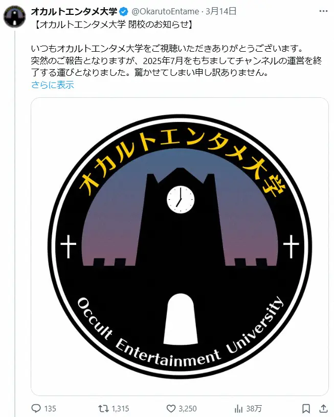 X(旧ツイッター)で「オカルトエンタメ大学 閉校のお知らせ」と投稿し「いつもオカルトエンタメ大学をご視聴いただきありがとうございます。突然のご報告となりますが、2025年7月をもちましてチャンネルの運営を終了する運びとなりました。驚かせてしまい申し訳ありません」と報告。