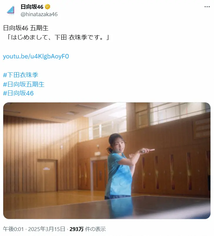 下田は、卓球に打ち込む姿を披露。日向坂の制服を身にまとい、笑顔で海辺を駆け抜ける様子とともに「千葉県出身、18歳。下田衣珠季です」と、自己紹介する声が流れた。