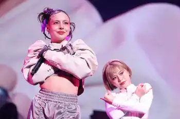 <沖縄アクターズスクール完全復活祭>フォトセッションに臨むI島袋寛子(左)、知念里奈(撮影・大城 有生希)