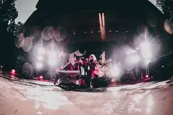 気温7度という冬のような冷え込みで迎えた幕開け。ドラムの景がスティックをカウントすると、1曲目「Ice Romancer」から天を切り裂くような爆音が鳴り響いた。霧雨が降る中、レインコート姿の観客が激しくヘッドバンキングで応じる。続く2曲目「心眼」では観客のジャンプと「オイ!オイ!」の大合唱。焚かれた白いスモークがまるで熱量から発する湯気のように上空に立ちこめた。4曲目「Rosario-ロザリオ-」では、真緒が曇天と対峙しながらシャウト。そのそばでベース・亜季がクールなたたずまいで正確なリズムを刻み、ギターの美月、剣は弦を弾き終えた瞬間に右手を高々と挙げ、客席のテンションを引き上げた。