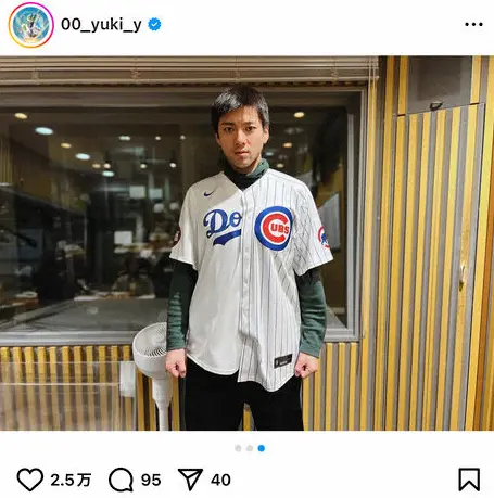 山田は自身がパーソナリティーを務めるニッポン放送「山田裕貴のオールナイトニッポン」の放送を前に「今夜もよろしくお願いいたします!」と呼びかけ。さらに「明日ドジャースVSカブスいきます」と明かし、右半分がドジャース、左半分がカブスの斬新なユニホーム姿を公開した。