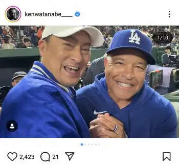 渡辺謙 メジャー開幕戦大満喫!ロバーツ監督やスター選手との2ショットに「最高にかっこいい」