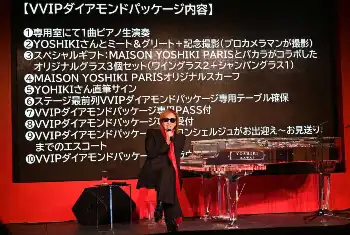 今年は、1席100万円の「VVIPダイアモンドパッケージ」も発売すると発表。世界最高額のチケットとなるようだ。YOSHIKIの背後のスクリーンに概要が映し出されると「ニコニコの配信みたい」と大笑い。チケット発売の詳細や より豪華さを増した、YOSHIKIディナーショー史上、最も豪華な形式も発表し、会場からは歓喜の声が聞こえた。