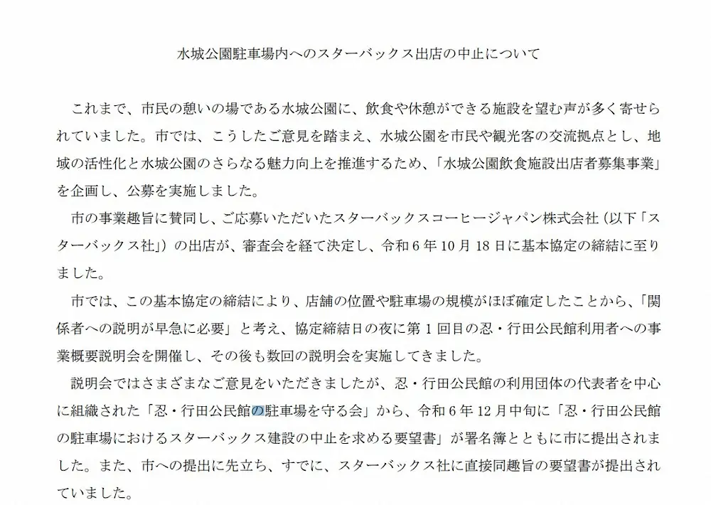 その結果「スターバックス社では、これらの状況を総合的に判断した結果、『住民の間で事業に対する意見の相違が解消されず、事業の進行に不安を感じる声が根強く残っている現状を重く受け止めていること、そのため、出店に際し大切にしている、地域社会の一員として寄り添い、共に成長することを通して、水城公園を訪れる方々にとって安心して集える場を提供すること、その実現が難しい』との結論に至り、水城公園飲食施設出店者募集事業への参加辞退が申し入れられました」という結論に至ったという。