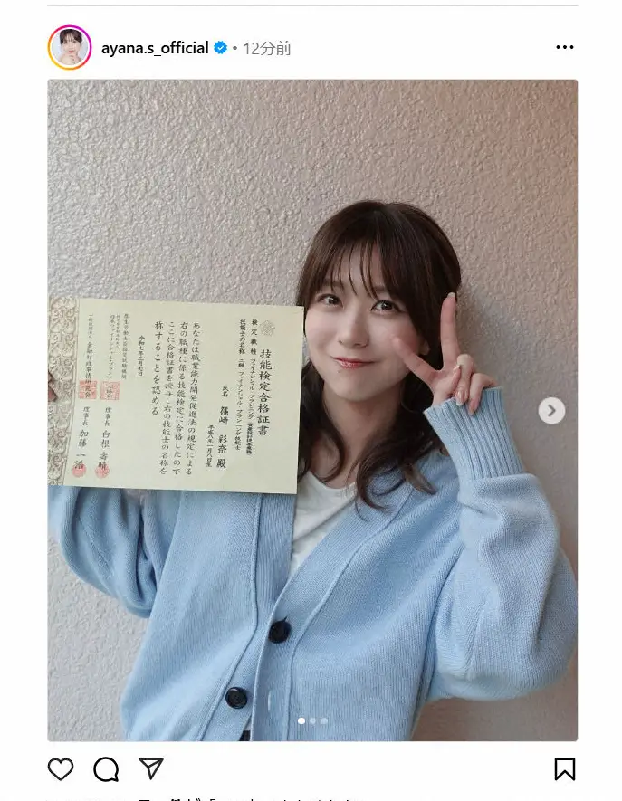 篠崎は「改めてご報告!ファイナンシャルプランニング2級試験に合格しました」と報告。