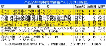 ( 人気の高さ裏付け/) さらに、15日に放送された開幕プレシーズンゲーム「巨人―ドジャース」は22・9%の5位、16日の「阪神―ドジャース」戦はデーゲームながら16・5%の9位で、今回、日本で行われた6戦中4戦がベスト10入り。今年の10位以内に入った試合全てがドジャース戦で“大谷ドジャース”の人気の高さを裏付けた。