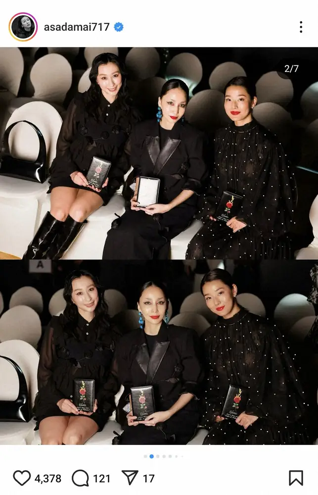 ファッションショーを見に訪れたとみられ、続く投稿では、同じく黒のファッションに身を包んだ歌手・中島美嘉、モデルで歌手のすみれとの3ショットも投稿した。