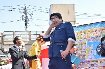 ひるちゃんは両さんの格好で登場。「眉毛のメーク決まらなくて、3回も書き直した」と話し、イベントでは指定された単行本の表紙に描かれた両さんのポーズを一切確認せずにマネする特技を披露。秋本氏から指定された巻の表紙のポーズをひるちゃんは見事に決め、秋本氏も「すごい!」「当たってる!」と満面の笑みを見せた。