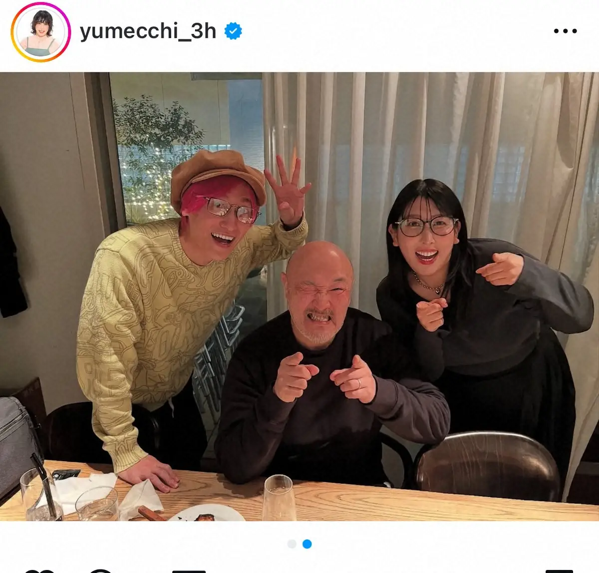 各々カメラ目線でポーズを決め、「珍メンごはん」「誰ひとりお酒を飲まない」「くまだまさしさん」「EXITかねちか」「3時のヒロインゆめっち」とハッシュタグで添え、終始楽しい会だったことをうかがわせた。
