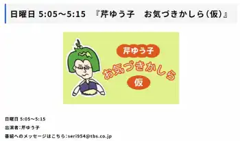 TBSラジオは21日に、4月からのタイムテーブルを正式発表。日曜日の午前5時5分から同15分まで新番組「芹ゆう子 お気づきかしら(仮)」を放送するとし、出演者の「芹ゆう子」のプロフィルについて「大正12年、満州生まれの102歳。宮城県で芹専門のリポーターをやっている設定の『芹ゆう子』」と紹介。番組内容については「時代を超えて、コンプラの波をすり抜け、歯に衣着せぬトークをお届けします。時に愚痴、時に説教、時には素敵な音楽を。朝の5時から失礼こきます。みなさん、お気づきかしら?」としている。