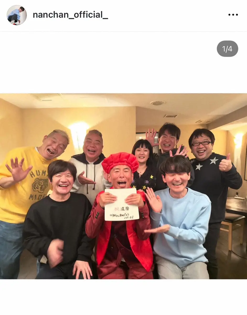 この投稿にフォロワーからは「ウリナリメンバー+出川さんだ!還暦の方がたくさんいらっしゃって、皆さんお元気そうなのが何より嬉しいです 胸熱です」「ウリナリ同窓会みたいですね」「おめでたい!お祝い楽しそうで何より」などのコメントが寄せられている。