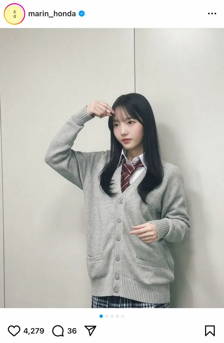 本田さんは「お衣装が制服だった日」と報告し、制服ショットを複数枚投稿。チェックのミニスカートにグレーのカーディガン、紺のハイソックスのコーデを披露した。