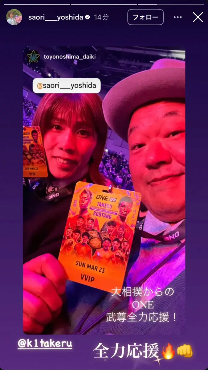 吉田さんは大相撲の元関脇でタレントの豊ノ島と共に観戦。会場での2ショットとともに「大相撲からのONE 武尊全力応援!」とつづった豊ノ島のストーリーズを引用し、「全力応援!」と続けた。