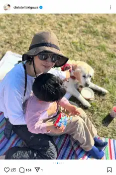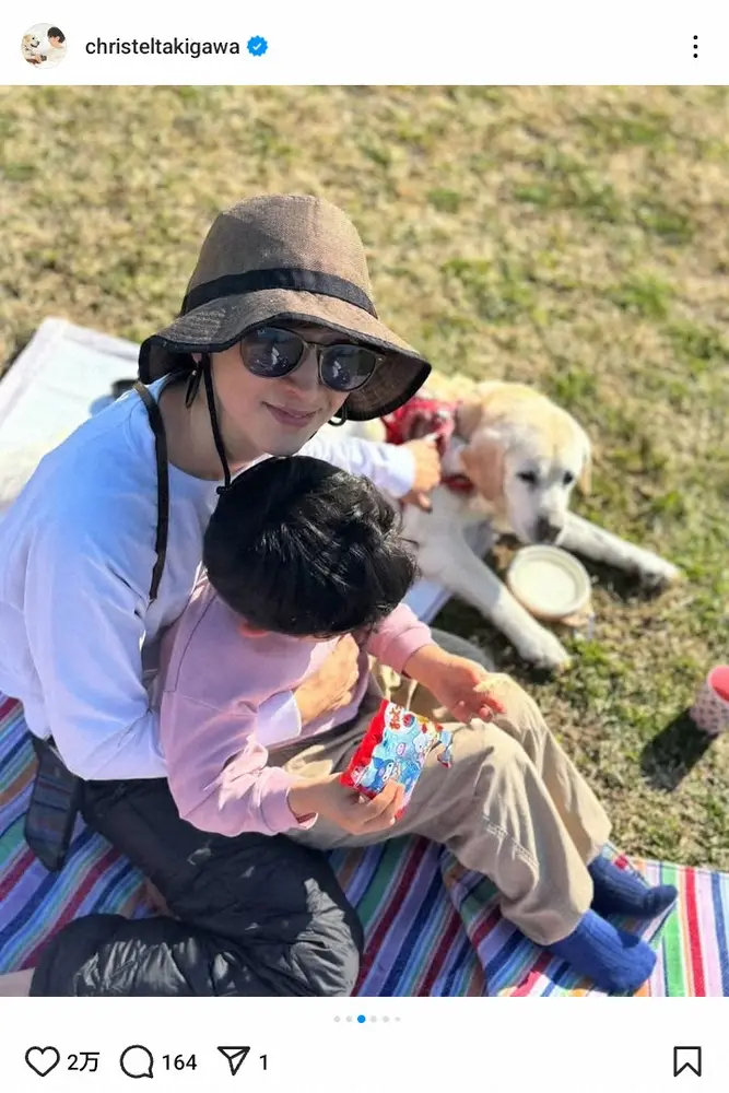 滝川は「先日、天気のいい日にアリスさんを連れて日向ぼっこ。ようやくそんな季節になってきました」と報告。5歳の長男や1歳の長女、愛犬とともに、日向でくつろぐ写真を公開した。