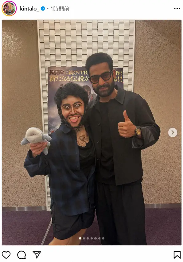 キンタロー。は、大ヒットインド映画「RRR」で主演を務めたインド人俳優のNTR Jr.との2ショットをアップ。映画「デーヴァラ」のジャパンプレミアで、本人のものまねをしてともに映画をPRしたという。