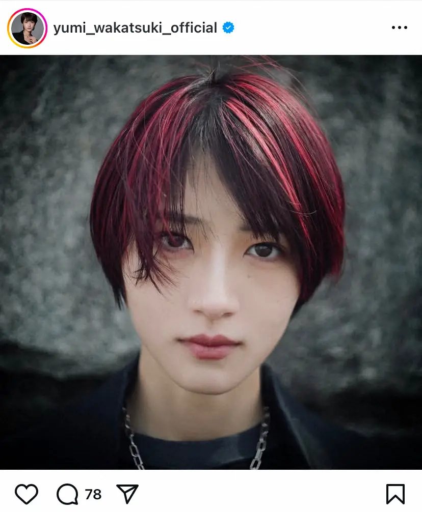 若月は赤髪にイメチェンしたヘアスタイルを披露。じっとカメラを見つめる表情について「アー写気味正面写真。いやむしろ証明写真か だとしたら目にかかってるから撮り直しだね」と解説した。