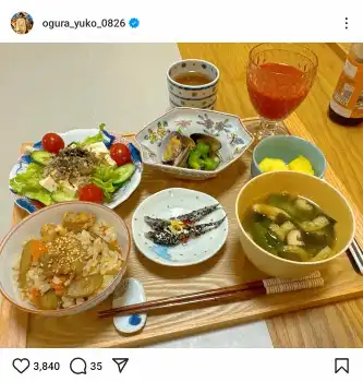 小倉は「昨日から長男がスキー合宿のため、次男と三男と三人でのご飯でした!」と、8歳の次男と4歳の三男と食卓を囲んだことを報告。「三人なのに渋すぎました」と打ち明け、「ただ、鰯の胡麻漬け以外は残さず食べてくれました」と伝えた。