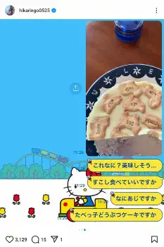 そしてメッセージアプリの画面も公開。そこには石田が送ったとみられる「これなに?美味しそう…」「すこし食べてもいいですか」「なにあじですか」「たべっ子どうぶつケーキですか」とのメッセージが連投されている。
