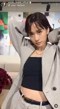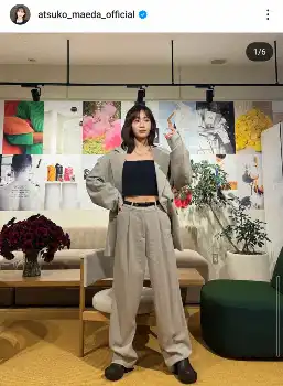 前田はマニッシュなオーバーサイズのスーツに、お腹がチラ見えするインナーのコーデの姿を披露。
