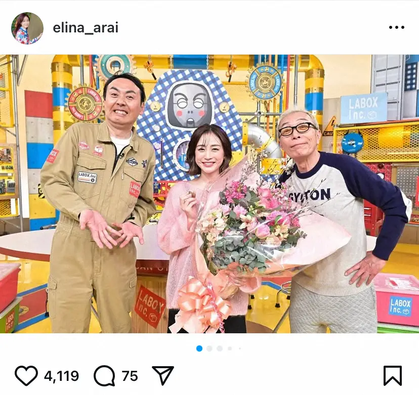 新井は花束を抱えた自身と、番組レギュラーの所ジョージ、お笑いコンビ「アンガールズ」田中卓志との3ショットをアップ。「これまで8年間、みなさんと同じ時間を共有させていただき、ありがとうございました」と改めて感謝を伝えた。