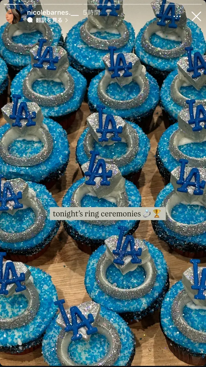 ニコル夫人は「今夜のリングセレモニー」と言葉を添え、ブルーの色鮮やかなカップケーキが並んだ様子を公開。ケーキの上にはドジャースのロゴを冠したキラキラと輝く指輪を模した飾りが添えられている。本物そっくりなケーキで夫の偉業をたたえた。