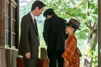 連続テレビ小説「あんぱん」第1話。屋村草吉(阿部サダヲ・左)と柳井嵩(木村優来)(C)NHK