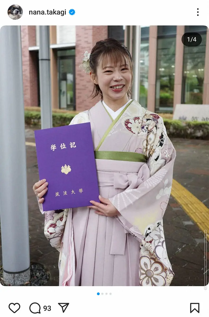 この日は薄紫色の袴を身に着け、「学位記」を手にした写真などを投稿。「3月29日に筑波大学院の博士前期課程を卒業しました 新しい出会いがあり、友達もでき 新しい事を学ぶことができた充実した2年間でした!!ありがとうございました!!」と感謝。