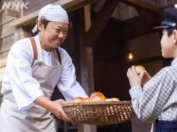 草吉のパンに人だかり。朝田釜次(吉田鋼太郎)も現れるが、草吉は「大人はお代を頂戴しますよ」。“本場”仕込みのパンとあり、1個10銭。手が出ない釜次をよそに、柳井千代子(戸田菜穂)が全部買っていった。
