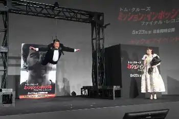 1作目の名シーンを再現した登場に「トム・クルーズ大好き芸人としていろいろやらせてもらったんですけど、こんなに何度も(ワイヤー)に吊ってもらう芸人僕しかいないと思う」とドヤ顔。大ファンとして「うれしいです!夢の夢。映画の企画で吊ってもらうという夢が本当に叶いました」と大興奮だった。