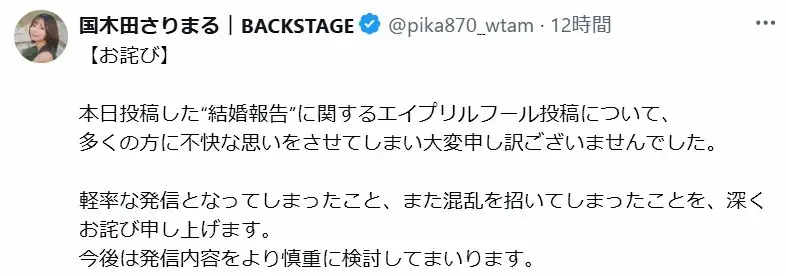 1日の午後9時頃、国木田氏は「お詫び」と題し「本日投稿した“結婚報告”に関するエイプリルフール投稿について、多くの方に不快な思いをさせてしまい大変申し訳ございませんでした」と謝罪。「軽率な発信となってしまったこと、また混乱を招いてしまったことを、深くお詫び申し上げます」とし、「今後は発信内容をより慎重に検討してまいります。この度は申し訳ございませんでした」と記した。