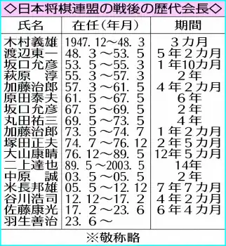 ○…連盟会長の業務は組織運営や棋戦協賛企業との交渉に加え、式典への出席など多岐にわたる。一般棋戦とタイトル戦の数は女流を含めると27。就位式や表彰式では壇上に立ち、スピーチや賞状授与などの役をこなさなければならない。昨年12月の達人戦では対局終了後に就位式に駆けつけ、式後は対局地へUターン。「このダブルヘッダーは初めての体験です」と話していた。