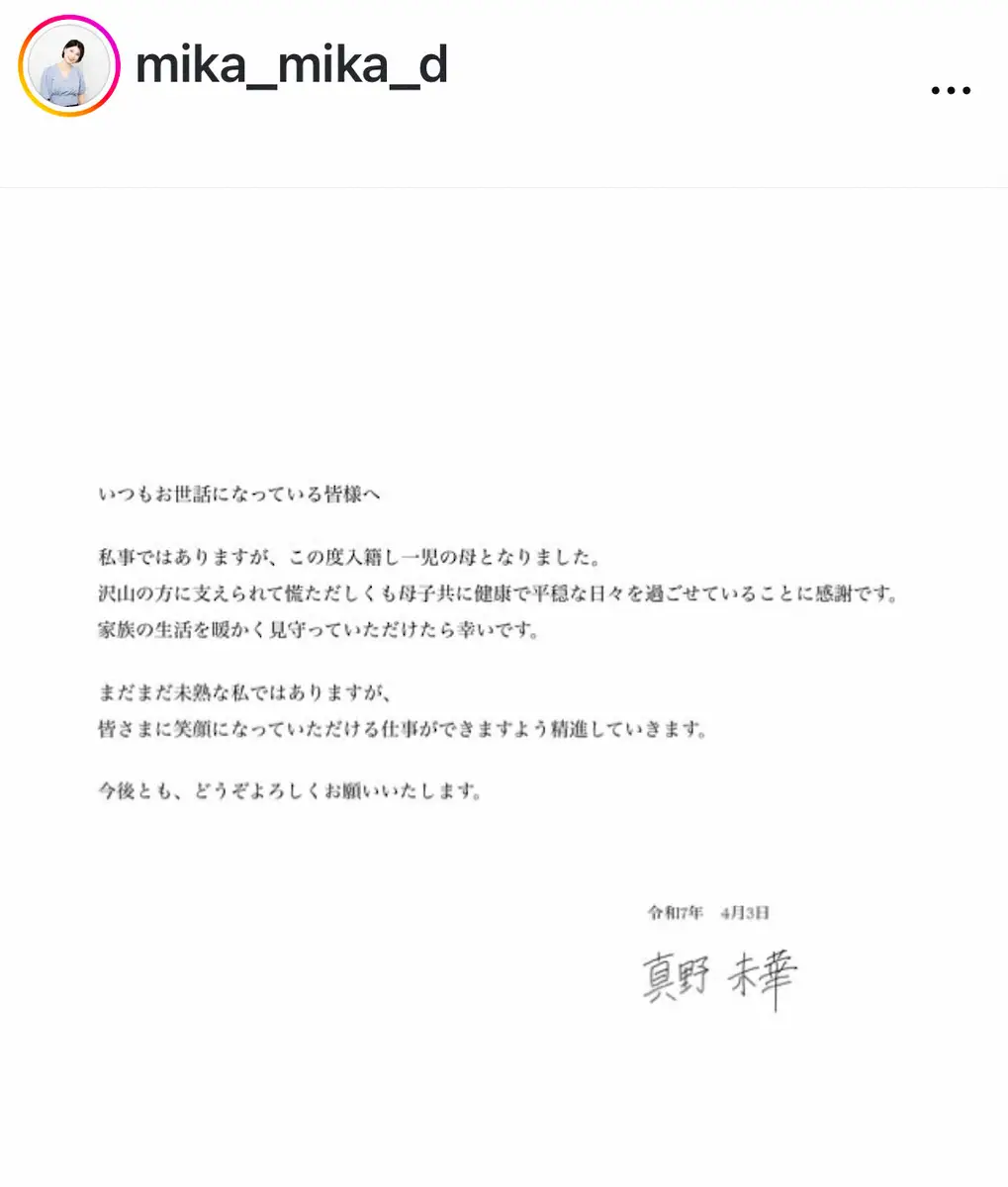 【画像・写真】真野未華 結婚&第1子出産を報告「母子共に健康で平穏な日々を過ごせていることに感謝」