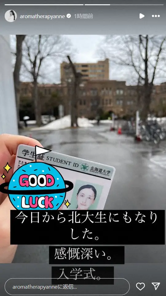 アンヌ遙香のインスタグラム(@aromatherapyanne)から 元TBS美人アナが北大入学を報告 学生証を披露「すごく特別な感慨が…しっ… ギャラリーで見る この記事のフォト 2025年04月03日の画像一覧 もっと見る 2025年04月03日の画像をもっと見る
