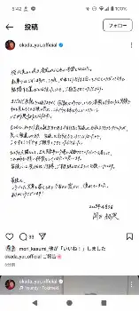 「ご報告」として手書きの文書の画像を投稿。文書には「桜が美しく咲き、春風が心地よい季節となりました。私事ではございますが、この度、かねてよりお付き合いをさせていただいている方と結婚する運びとなりましたことを、ご報告させていただきます」と結婚したことを発表した。