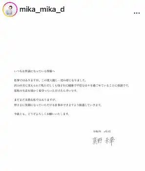 真野は直筆署名入りの文書と投稿。「私事ではありますが、この度入籍し一見の母となりました。沢山の方に支えられて慌ただしくも母子共に健康で平穏な日々を過ごせていることに感謝です。家族の生活を暖かく見守っていただけたら幸いです」とつづった。