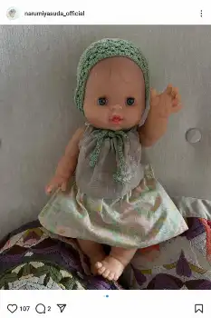 安田は「ちょっと危ないおばさんになってきています」と告白。「ベビー人形の服と帽子まで作ってる!」と、淡いグリーンの帽子をかぶって服を着た人形との写真を公開した。