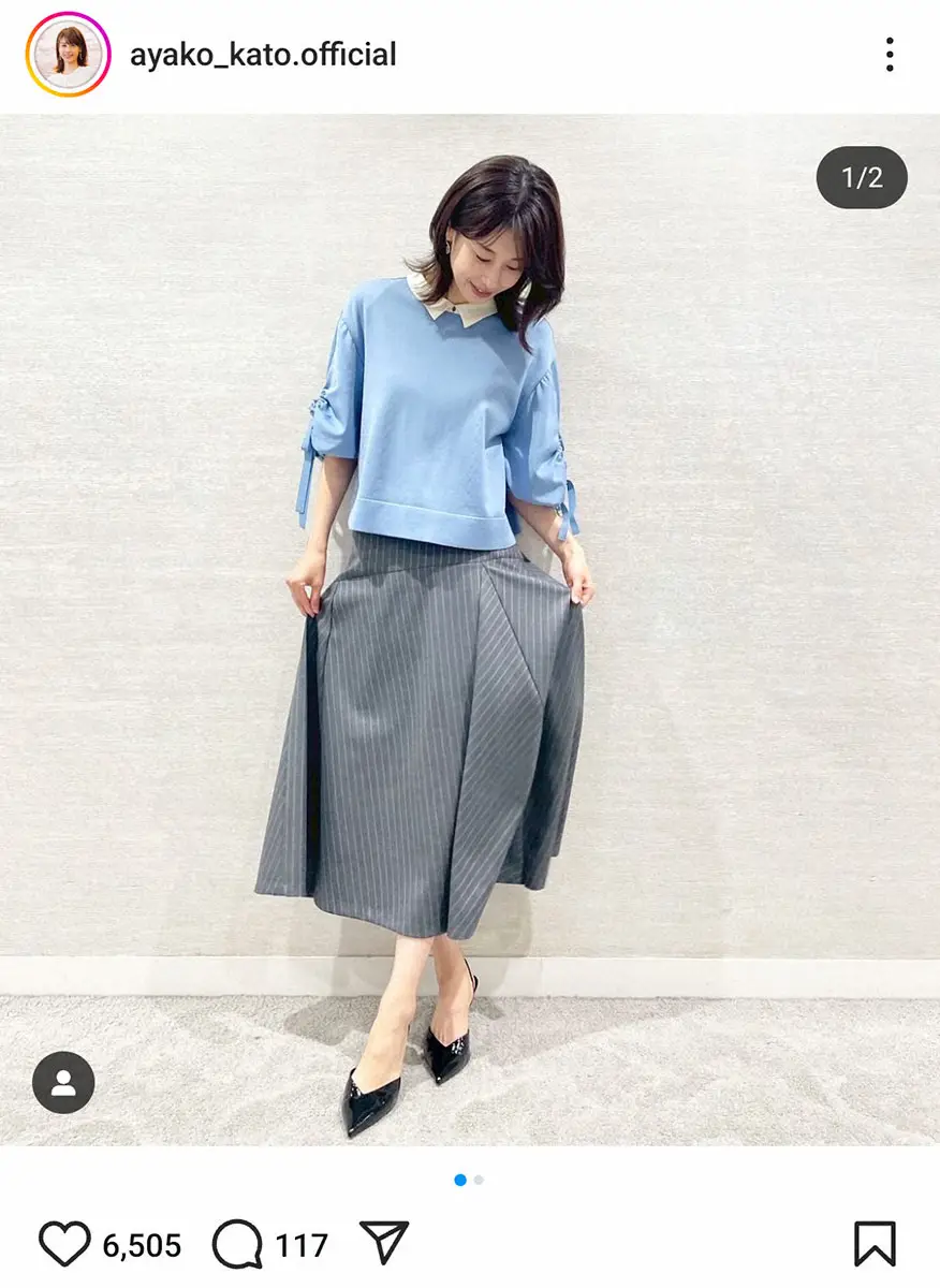 「ナゼそこ?+」の3日放送を終え、「初回放送も無事終わりホッとしております」と衣装姿のショットを投稿。そして「衣装も紹介させて下さい」とブルーのニットとグレーのストライプのスカートはランバン コレクション、ピアスは「La Soeur」のものだと明かした。