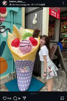 「美ら海水族館に向かう途中でアメリカンビレッジにも寄ったよ 街並み可愛くて沖縄旅行来たら絶対行っちゃうっ」と沖縄旅行を報告。