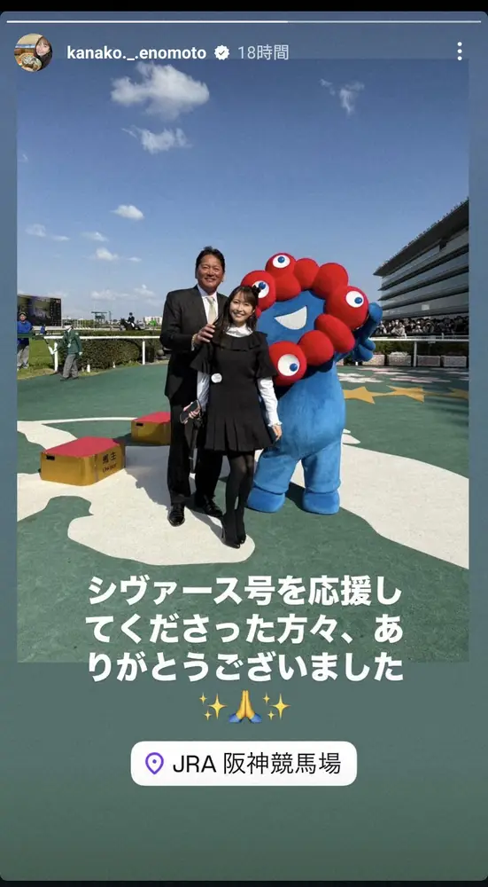 ストーリーに阪神競馬場での黒のミニワンピ姿の自身と佐々木氏、大阪・関西万博の公式キャラクター「ミャクミャク」の3ショットをアップ。