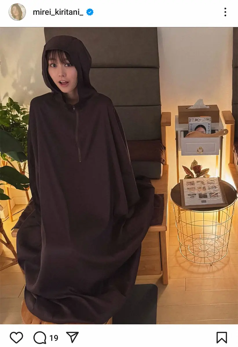 桐谷は全身を覆ったフード付きのマント姿でよもぎ蒸しをしている姿を投稿し「初めてよもぎに蒸されてみたよ」とつづった。